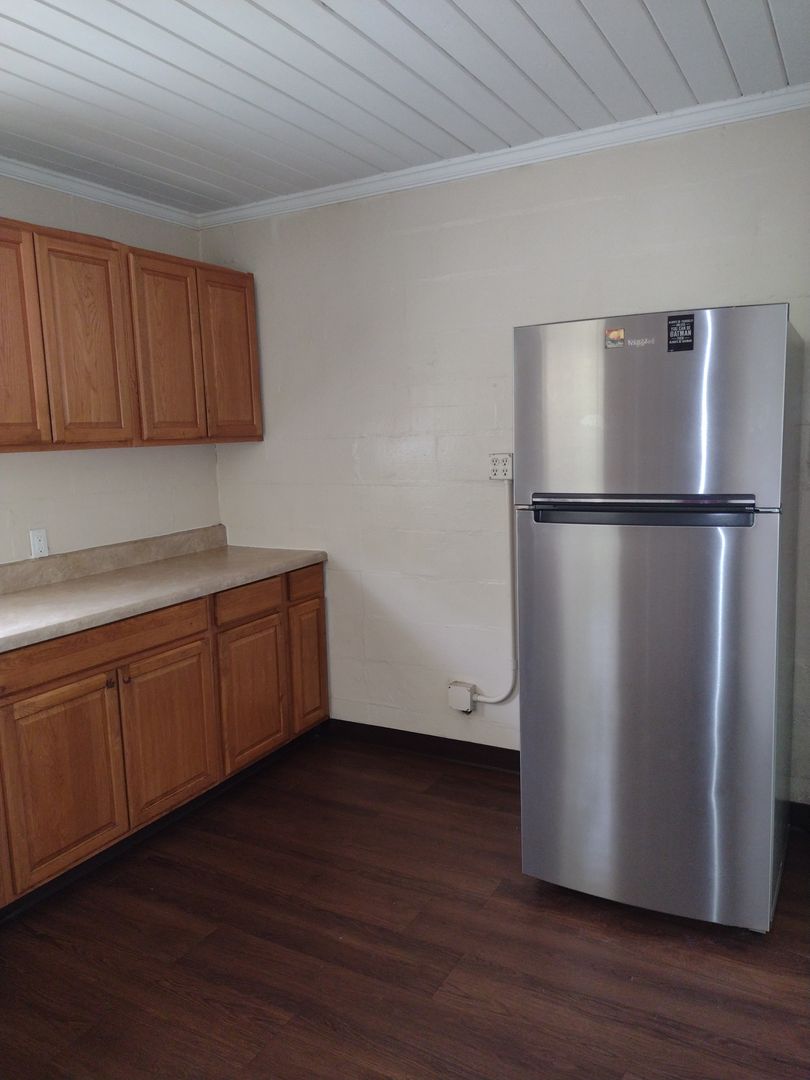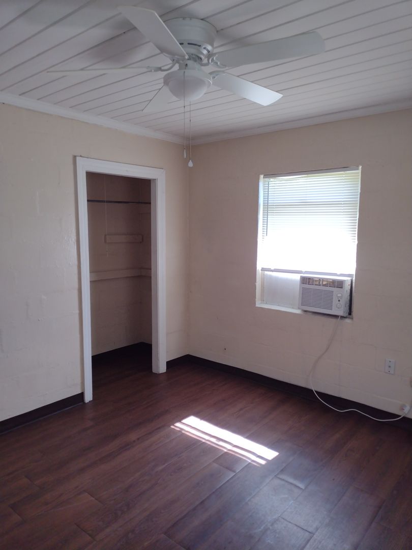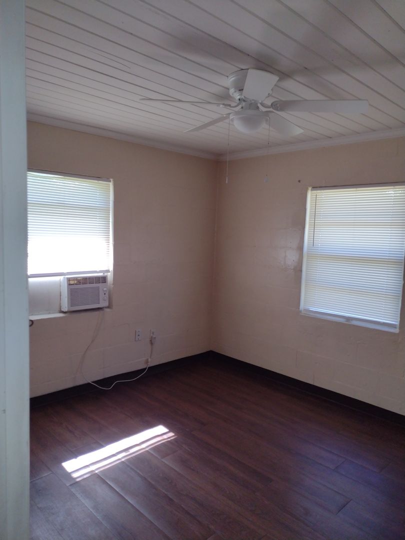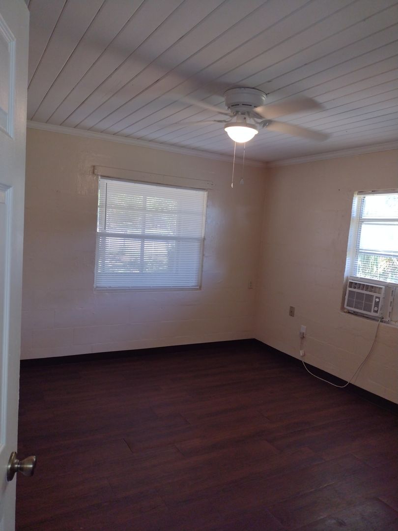 Newer vinyl plank flooring throughout. Upgraded bathroom. Gas stove, stainless steel refrigerator, window AC units in main room and both bedrooms.